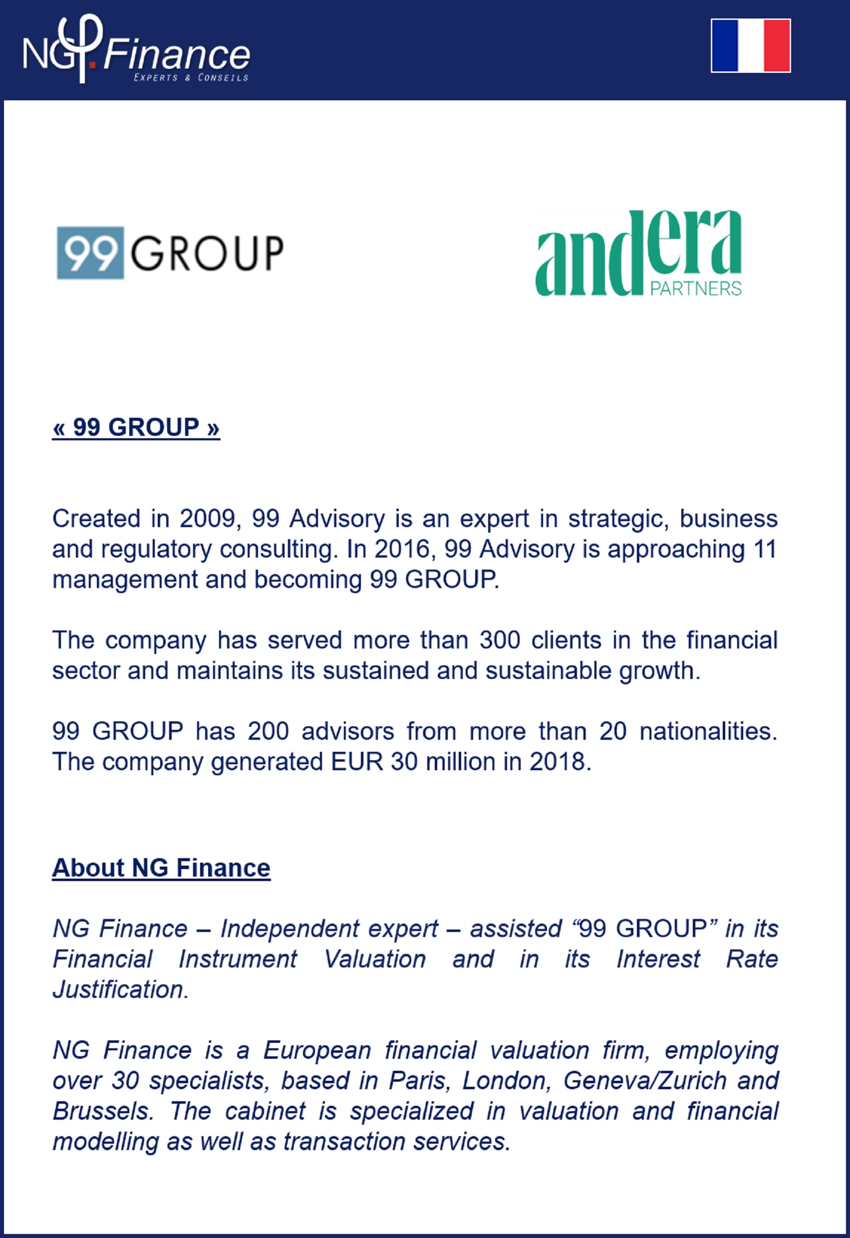 NG Finance a accompagné 99 GROUP dans sa valorisation d’instruments financiers et sa justification de taux d’intérêt