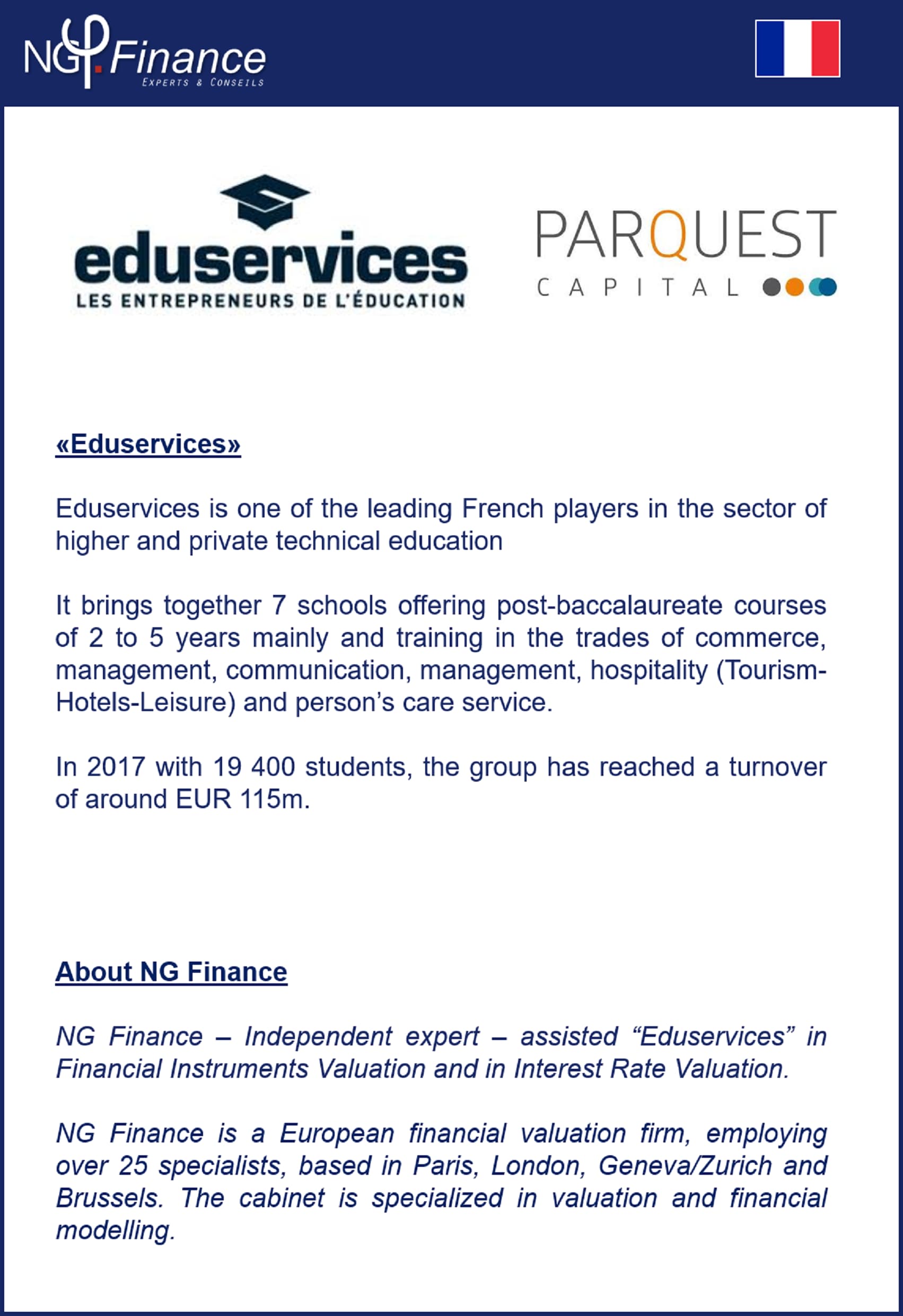 Eduservices – NG Finance a accompagné la société Eduservices dans sa valorisation d’instruments financiers et sa justification de taux d’intérêt