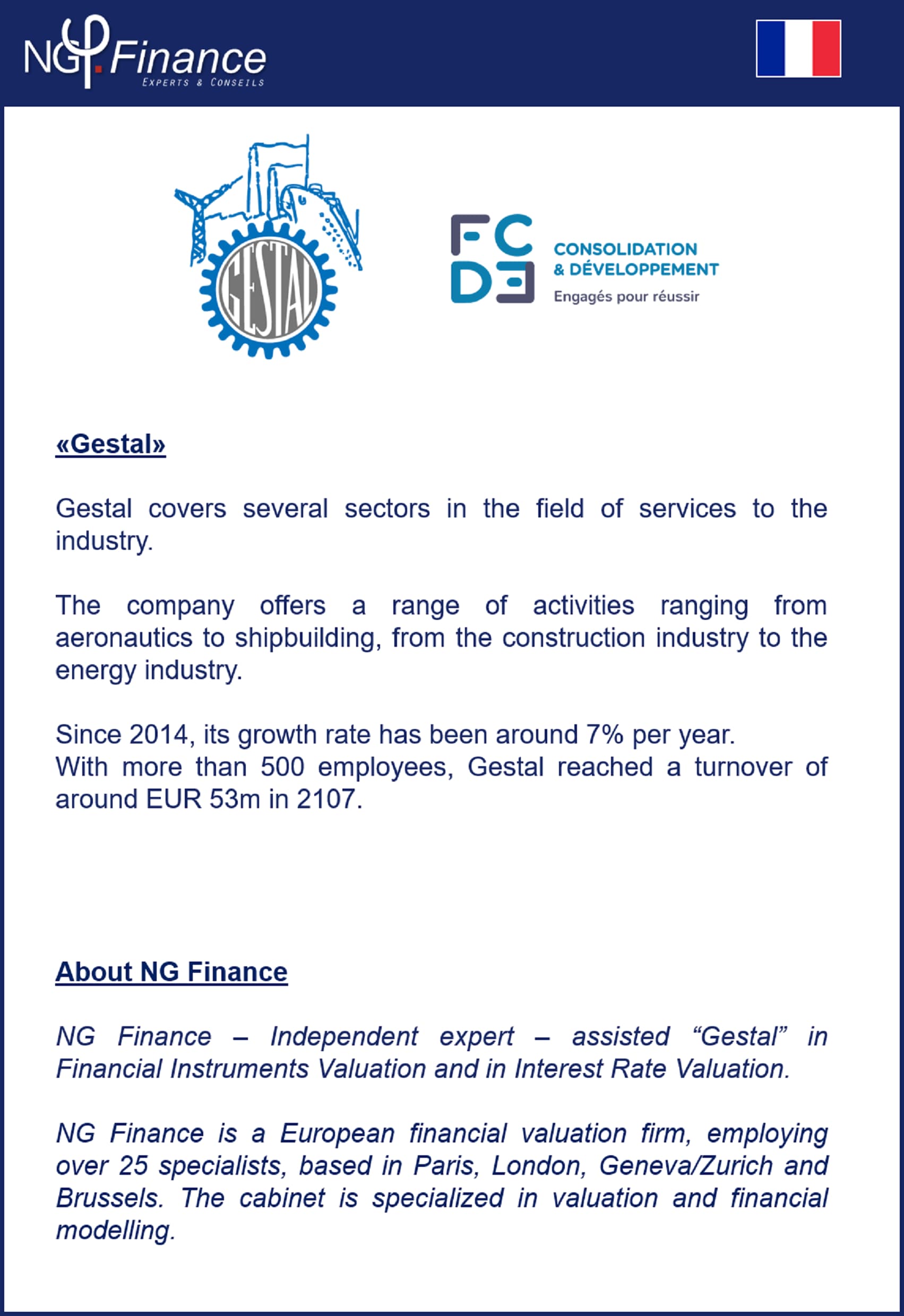 Gestal – NG Finance a accompagné la société Gestal dans sa valorisation d’instruments financiers et sa justification de taux d’intérêt