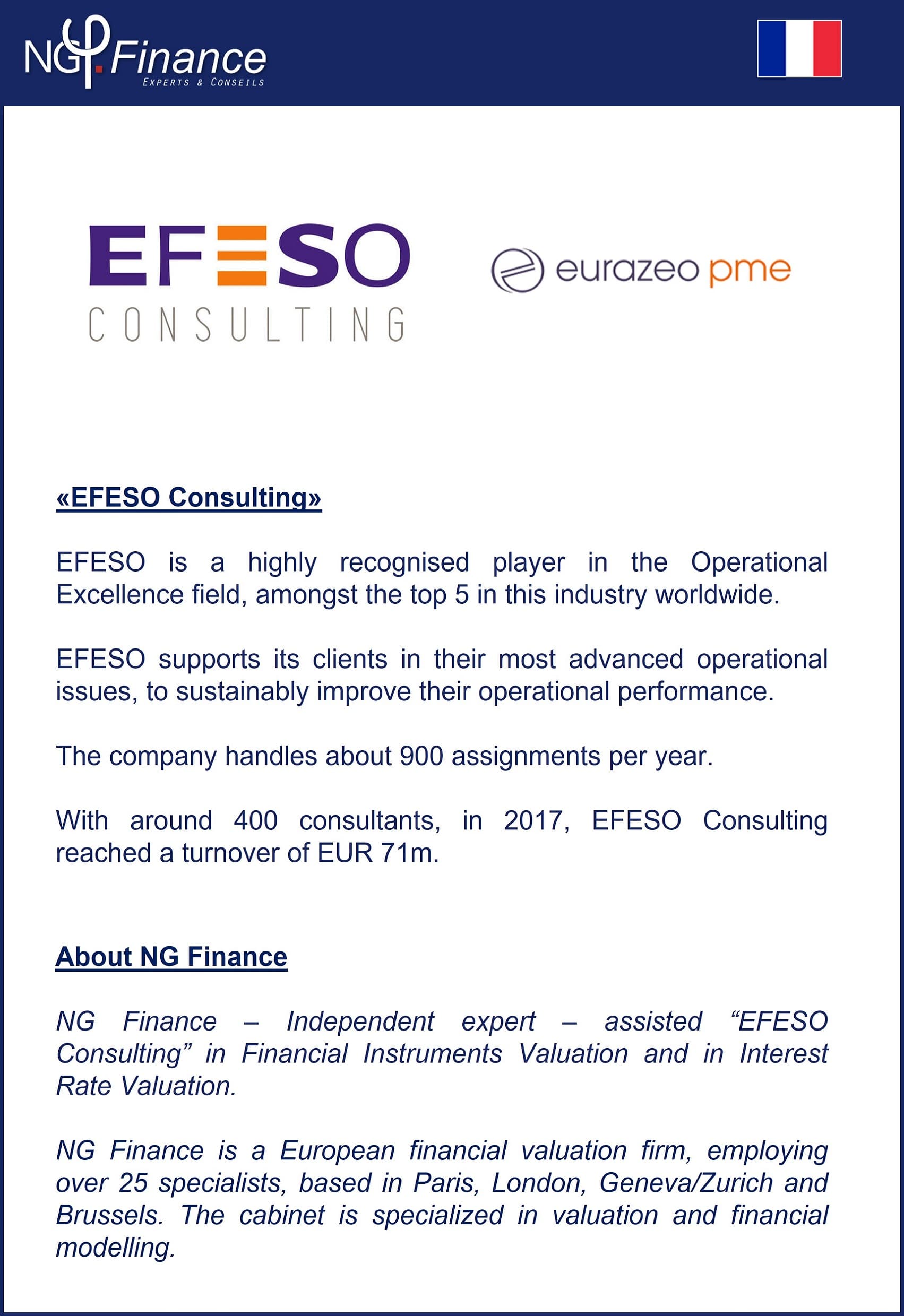 EFESO Consulting – NG Finance a accompagné la société EFESO Consulting dans sa valorisation d’instruments financiers et sa justification de taux d’intérêt