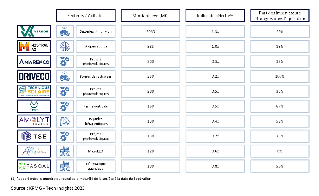 Ce classement est dominé par Verkor qui représente plus de la moitié des fonds levés en 2023 par ce top 10. Cette levée représente à elle seule plus que le reste des 10 premières entreprises réunies. Le classement met en avant des sociétés Techs opérant dans différents secteurs et semble représenter la profondeur de la technologie française, démontrant l’engouement pour les technologies mobiles et durables. L’intérêt des investisseurs pour les thèmes du développement durable et le désir de participer à la révolution des méthodes de production, de consommation et de mobilités ont permis à ces industries de maintenir des opérations à grande échelle.